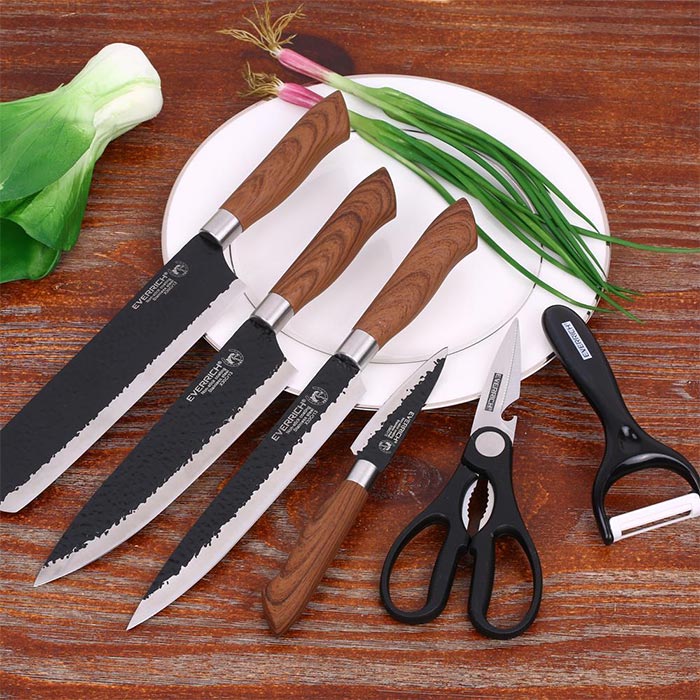 Discover a refined set including a Chinese chef knife, a utility knife, a small cleaver, a peeler, a pair of scissors, and a ceramic peeler. Made of premium wood and with non-stick stainless steel blades. Upgrade your kitchen now!
