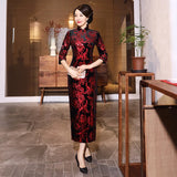 Zeer elegant, deze rode en zwarte Chinese jurk geeft je alle elegantie van een geweldige Chinese dame. Het motief vertegenwoordigt rode en zilveren bloemen en vormt een uitstekend contrast met de zwarte achtergrond die een bepaalde diepte geeft aan deze jurk. De rechte en lange snit wordt versterkt door een spleet die de benen onthult, zoals de Chinese mode wil.
