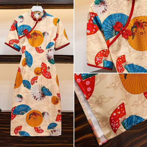 Este excelente vestido chinês é decorado com dezenas de fãs que lembram a tradição chinesa. O passe Mao, fechado com uma borda vermelha, estica a diagonal no peito e até o fundo da saia. Este vestido de estilo Qipao, perto do corpo, mas confortável, destacará sua silhueta.
